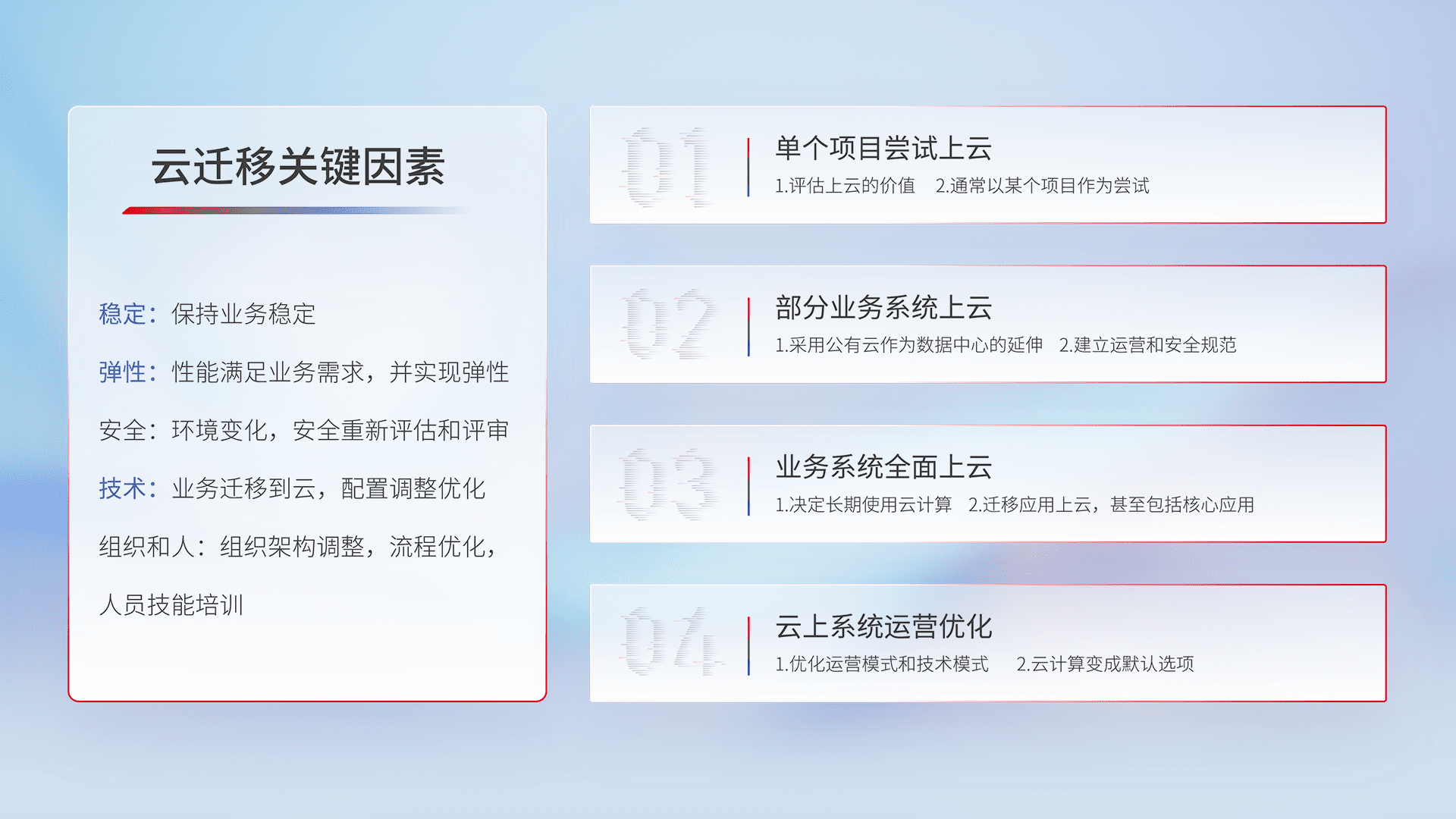 结合实际业务,,,从规划设计、、、、云平台选型、、、、云原生改造、、、、数据迁移、、、、集成交付,,迁移全过程为客户识别最佳上云路径,,做好风险识别管理,,设计网络架构、、、、身份权限、、、安全审计合规、、、操作审计、、日志审计、、、监控告警策略、、、多站点容灾设计等,,对云上基础设施进行整体规划,,,,提升IT治理水平,,,,以满足弹性、、、高可用、、、高性能的需求。。