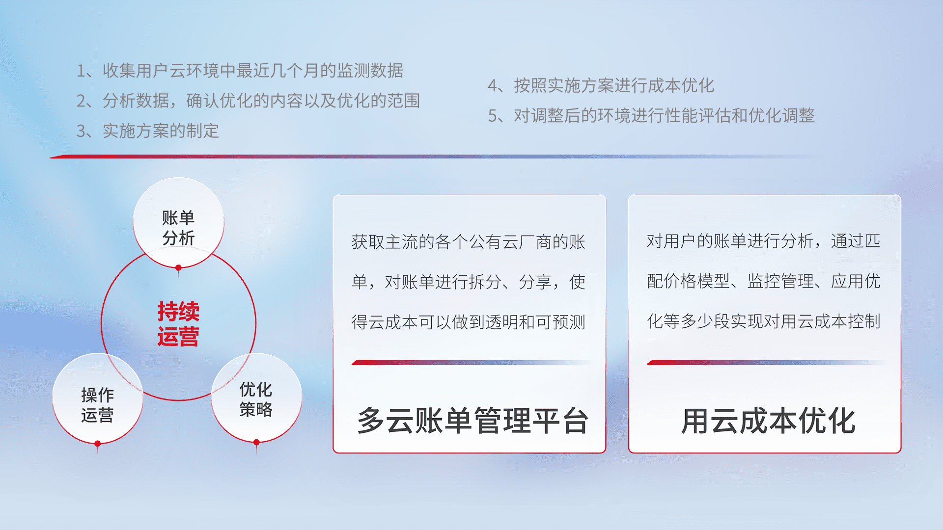 通过多云纳管,,,,以统一的资源数据模型把客户的云资源进行抽象和封装,,,进而实现对多云资源的统一操作,,,保障云资源管理的可靠性、、、稳定性与可用性。。。量身定制化运维内容,,,配置、、开发运维、、、、补丁管理、、、、备份、、、、监控、、认证和访问管理、、审计和日常巡检等,,,,保障在用云过程中的可靠度,,稳定度以及高可用率。。。。